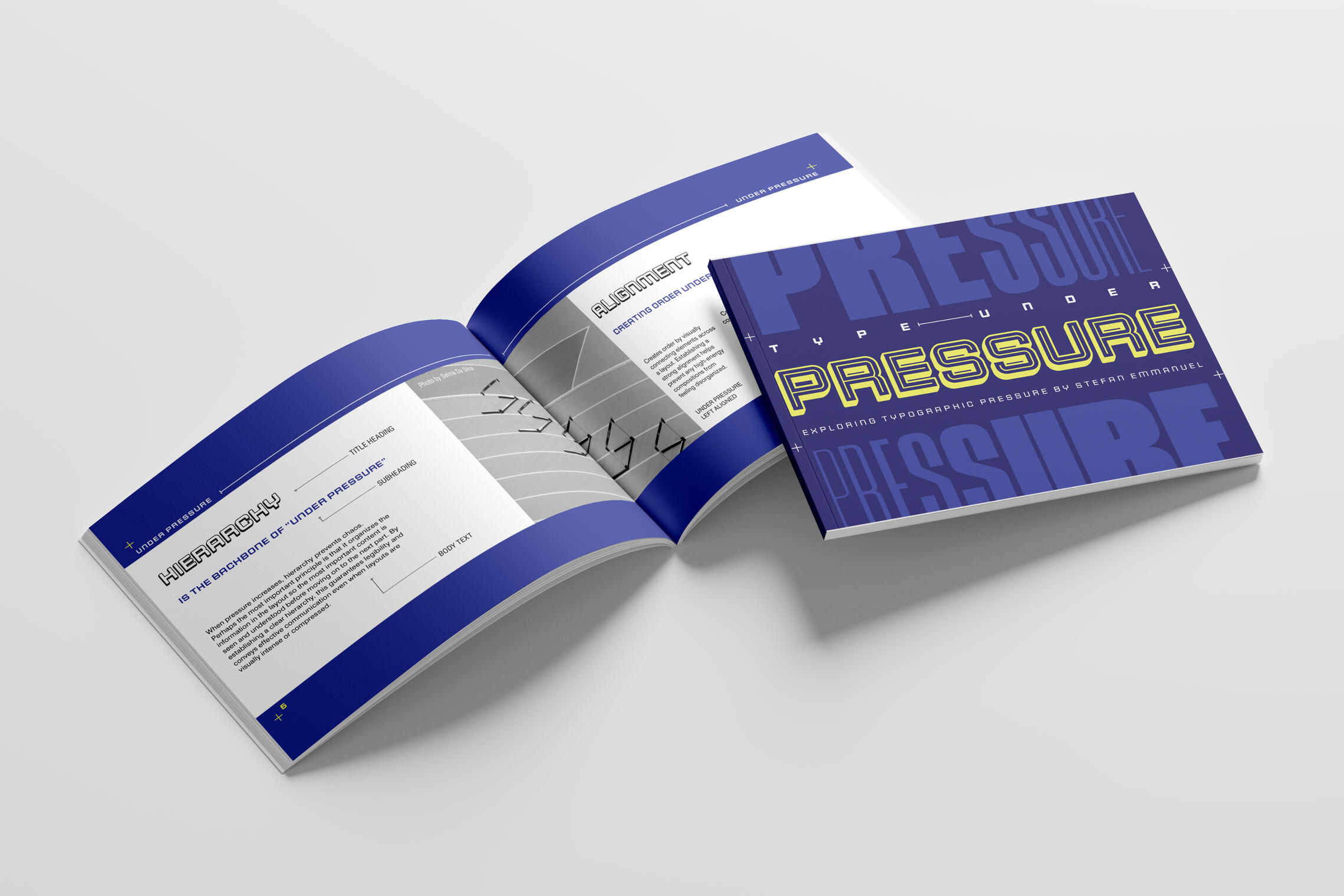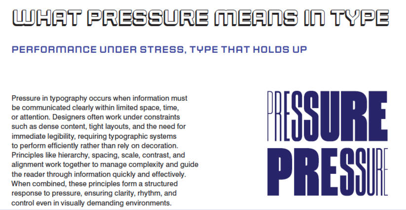 The project explores how typography performs under constraint, limited space, dense information, and the need for immediate legibility. Inspired by athletic design systems and fast-paced sports environments, the booklet treats pressure not as chaos, but as a structured condition resolved through hierarchy, rhythm, and organized visual systems. His project reflects a broader design philosophy, centred on building typographic systems that balance bold visual impact with clarity under constraint. Inspired by magazine design and sports visuals, Type Under Pressure shows how organized systems can turn complicated information into clear and energetic visual messages.